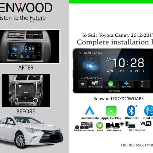 We offer a Complete Car Stereo Upgrade to suit your Toyota Camry 2012-2017 Model. We added the Kenwood DDX920WDABS Built-in Wi-Fi®, 6.8inch HD Capacitive Touch Screen AV Receiver. to match the Toyota Camry 2012-2017.