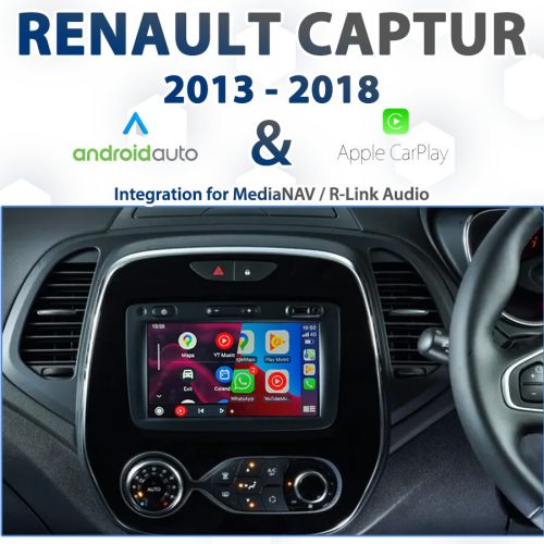 Product OverviewUpgrade your Renault Captur (2013 to 2019 models) with Apple CarPlay and Android Auto integration, designed for vehicles equipped with MediaNAV audio. This system allows you to display CarPlay and Android Auto directly on your vehicle’s original screen, while also offering an external toggle button for switching between the navigation system and original radio.